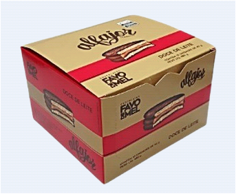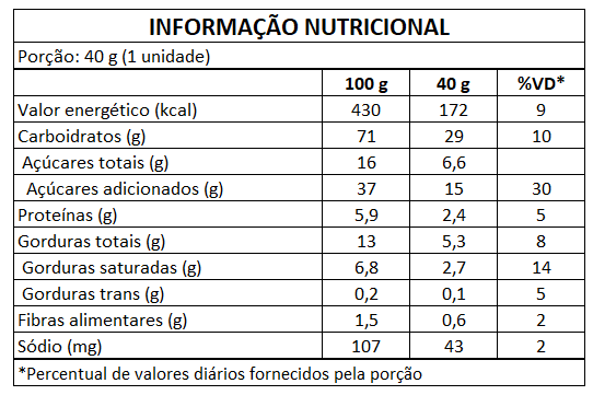INGREDIENTES: Doce de leite para confeitaria (açúcar, leite em pó integral reconstituído, xarope de glicose, soro de leite e lactase, conservante: sorbato de potássio (INS 202), regulador de acidez: bicarbonato de sódio (INS 50ii) e estabilizante: citrato de sódio (INS 331ii)), bolacha (farinha de trigo enriquecida com ferro e ácido fólico, açúcar, amido de milho, glucose, cacau em pó, emulsificante: lecitina de soja (INS 322), fermentos químicos: bicarbonato de sódio (INS 500ii) e bicarbonato de amônio (INS 503ii), conservante: propionato de cálcio (INS 282), aromas idênticos ao natural de baunilha e limão) e chocolate meio amargo.