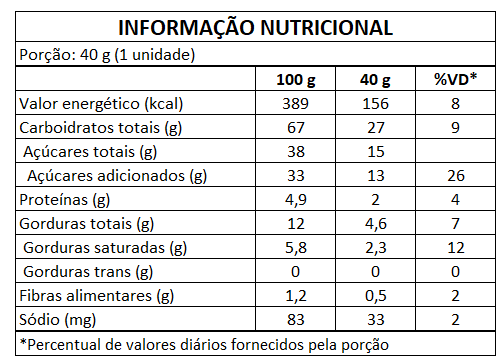 INGREDIENTES: Doce de leite para confeitaria (leite reconstituído, soro de leite reconstituído, açúcar, glucose, bicarbonato de sódio, conservante: sorbato de potássio e estabilizante: citrato de sódio e lactase). Bolacha (farinha de trigo enriquecida com ferro e ácido fólico, açúcar, amido de milho, gordura vegetal, glucose, cacau em pó, emulsificante: lecitina de soja (INS 322), fermento químico: bicarbonato de sódio (INS 500ii) e bicarbonato de amônia (INS 503ii), conservante: propionato de cálcio e aromatizantes) e cobertura sabor chocolate meio amargo