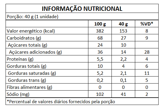 INGREDIENTES: Massa (farinha de trigo enriquecida com ferro e ácido fólico, açúcar, gordura vegetal, ovo, açúcar líquido invertido, fermento químico: bicarbonato de sódio (INS 500ii), conservantes: propionato de sódio (INS 281) e sorbato de potássio (INS 202) e aroma idêntico ao natural de baunilha), doce de leite para confeitaria (açúcar, leite em pó integral, xarope de glicose, soro de leite, lactase, conservante: sorbato de potássio (INS 202), regulador de acidez: bicarbonato de sódio (INS 500ii) e estabilizante: citrato de sódio (INS 331ii) e açúcar.